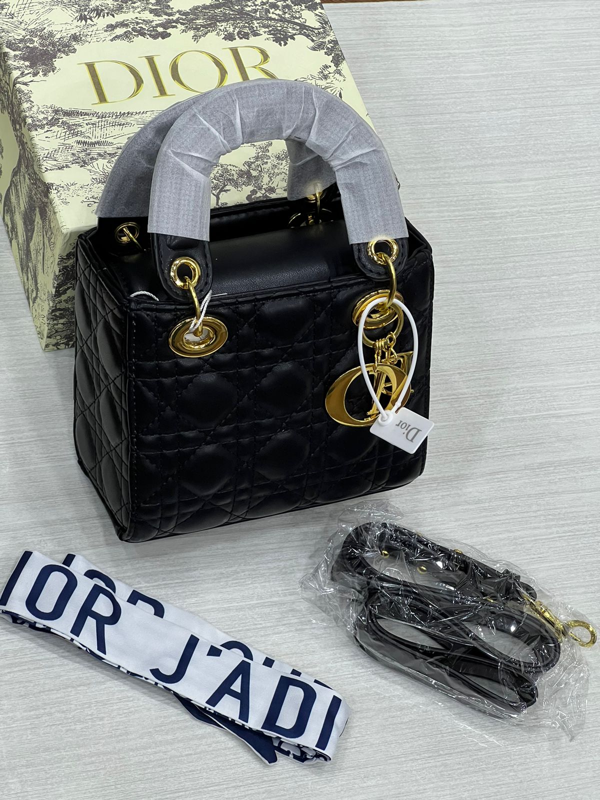 The Lady Dior tote is a Dior creation that has gained recognition worldwide and is today a coveted bag that every fashionista craves to possess. This black tote has been crafted from leather, and it carries the signature Cannage quilt. It is equipped with a fabric interior and two top handles. The gorgeous piece is complete with the classic Dior letter charms.
